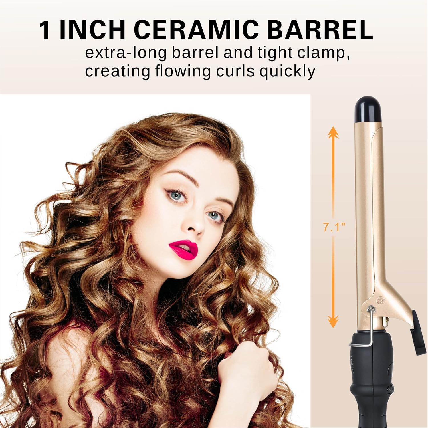 - ✅Extra long barrel: This 1 inch curling iron features an extra-long barrel and tight clamp. which means you can create flowing curls with ease for long and thick hair. producing consistent long lasting waves. 360° swivel power cord helps to prevent tangling and 1.9 meter cord is long enough to provide flexibility while styling.